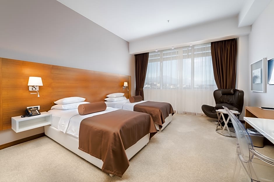 Featuring free toiletries and bathrobes, this twin room includes a private bathroom with a shower, a hairdryer and slippers. The air-conditioned twin room features a flat-screen TV with cable channels, a mini-bar, a seating area, a wardrobe as well as city views. The unit has 2 beds.